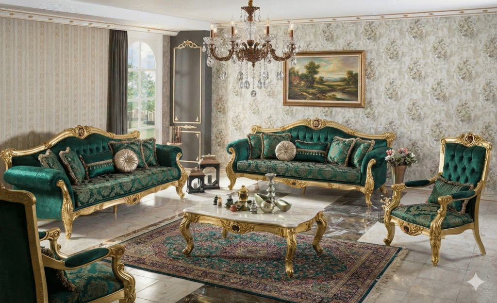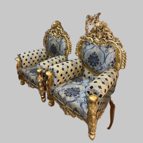 Transform your living space into a palace of grandeur. This exquisite sofa set features masterfully hand-carved wooden frames finished in radiant antique gold. Upholstered in premium, high-density fabric with tufted detailing, it offers both regal aesthetics and unmatched comfort. Designed for those who believe that true luxury lies in the details.